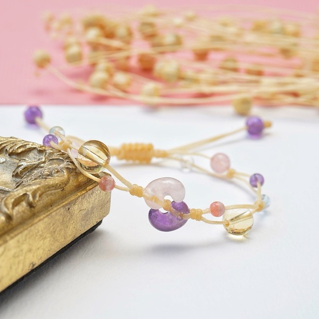 小さくて可愛い勾玉と 優しい色合いの石達を合わせて お作りしました♬ 勾玉を2つ向かい合わせ 【結の形】になるように編み込んでおります✧ いっきに手元が華やかになりますよ♪ サイズの調節も簡単です! 愛と美を司る・絆を深める お守りといわれています。 すてきなお守りとなりますように…! *ラッキーカラー ピンク・紫 ラッキーカラーはこちらから↓ https://anahita-style.com/lucky/ 当店の勾玉についてはこちらをご覧下さい♪↓ https://tamayura143.theshop.jp/blog/2021/09/12/103257 *天然石 ローズクォーツ(10ミリ勾玉) アメジスト(10ミリ勾玉) シトリン(8ミリ) ラベンダーアメジスト(6ミリ) ディープスターローズクォーツ(6ミリ) ロードクロサイト(4ミリ) ラベンダーアメジスト(4ミリ) カット水晶(4ミリ) ブルートパーズ(4ミリ) *ロウビキ紐 キナコ *サイズ 内径約16センチ 最大約23.5センチまで大きくなり、 お好みのサイズに調節できます! 試着画像は、 手首約14センチのスタッフが つけたときです *ご購入前にこちらをご確認ください↓ https://tamayura143.theshop.jp/blog/2021/02/01/172251 ※配送方法でレターパックをご選択の場合も 日時指定の選択画面が表示されますが、 レターパックでは日時指定の 対応をしておりません。 最短でお届けさせていただきますので 予めご了承ください。 ※税込¥8,000以上ご注文の場合は ヤマト宅急便でお送り致します。 レターパックご希望の方は 備考欄へご記入お願い致します。